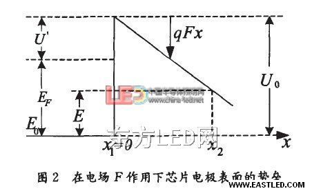 圖2為在電場f’作用‘F芯片電極表面的勢壘圖,其中EF為費(fèi)米能級(jí),U,為電子發(fā)射勢壘。由圖