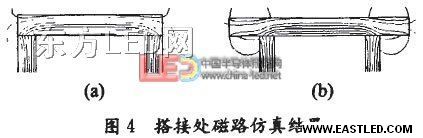 檢測時(shí)將繞有線圈的U型磁芯的一端插進(jìn)圖1所示1閉合回路,感應(yīng)LED支架回路中回路電流產(chǎn)生的交變磁通,再將條形磁芯搭接在U型磁芯上,使感應(yīng)磁路閉合。由于搭接方法不同,兩種搭接方法的磁芯線圈處在支架回路所產(chǎn)生的交變磁場中時(shí),其搭接處磁路也將不同,用Ansoft Maxwell軟件仿真兩種搭接方法的磁芯搭接處在交變磁場中的磁回路,成果如圖4示