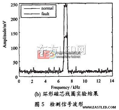 為了比擬條形磁芯線圈與環(huán)形磁芯線圈對封裝缺點(diǎn)檢測精度的影響,現(xiàn)分辨應(yīng)用條形磁芯線圈和圖3(a)示環(huán)形磁芯線圈進(jìn)行實(shí)驗(yàn)。磁芯材料為PC40,其初始相對磁導(dǎo)率約為2300,條形磁芯的外形幾何尺寸為1.6minx3.2ram×20mm,線圈匝數(shù)為300匝;環(huán)形磁芯橫截面尺寸為1.6mm×3.2mm,其有效磁路長度約即是條形磁芯,線圈匝數(shù)為300匝。實(shí)驗(yàn)中鼓勵(lì)光源為一種超高亮度貼片式白光LED,鼓勵(lì)光源用占空比為50%的方波信號(hào)驅(qū)動(dòng),方波信號(hào)可由一系列正弦變更的信號(hào)疊加而成,使其基頻與諧振回路的工作頻率雷同,即LC諧振回路實(shí)現(xiàn)了對方波信號(hào)的選頻,所以穿過線圈磁通鏈的變更率就是方波基頻信號(hào)的變更率;檢測對象分辨是GaP材料12mil黃色焊接質(zhì)量合格的LED和焊接過程中芯片電極有非金屬膜的LED。從線圈兩端輸出的信號(hào)經(jīng)放大、濾波、峰值檢波后見圖5。實(shí)驗(yàn)中放大器的放大倍數(shù)為103倍。
