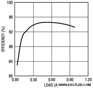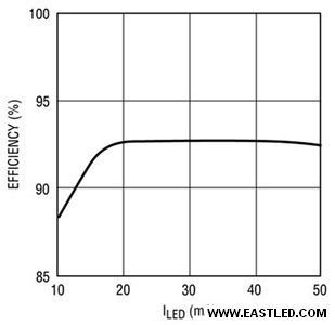 圖3顯示某LED驅(qū)動器解決計(jì)劃的效率可高達(dá)93%,它免除了對任何功率組件進(jìn)行散熱的需要,從而實(shí)現(xiàn)了非常精小的接腳占位。固然圖2中的電路是升壓模式架構(gòu),但應(yīng)用了奇特的高壓側(cè)電流檢測設(shè)計(jì),使其還能夠根據(jù)利用的特別請求而被配置成升壓、降壓模式、升降壓模式或反馳式架構(gòu)。