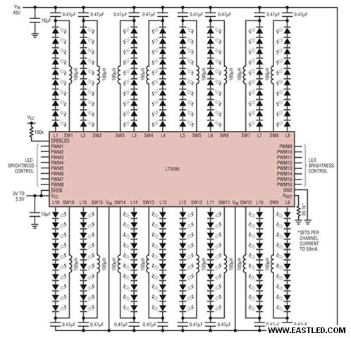 圖5 一個(gè)從45伏特輸進(jìn)來驅(qū)動一百六十個(gè)白光LED的十六信道LED驅(qū)動器示意圖。(PWM調(diào)光比為5000:1)