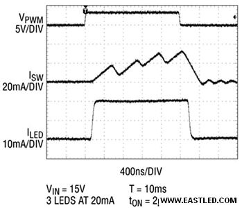 圖7表現(xiàn)5,000:1PWM調(diào)光波形和一個(gè)外觀非常方正的LED電流波形。即使在導(dǎo)通時(shí)間僅為2微秒的情況下,一個(gè)20毫安LED電流仍然與100Hz的PWM訊號同步接通和關(guān)斷。下降PWM頻率可以實(shí)現(xiàn)較高的PWM調(diào)光比,但100Hz頻率能夠確保不呈現(xiàn)可見閃耀。